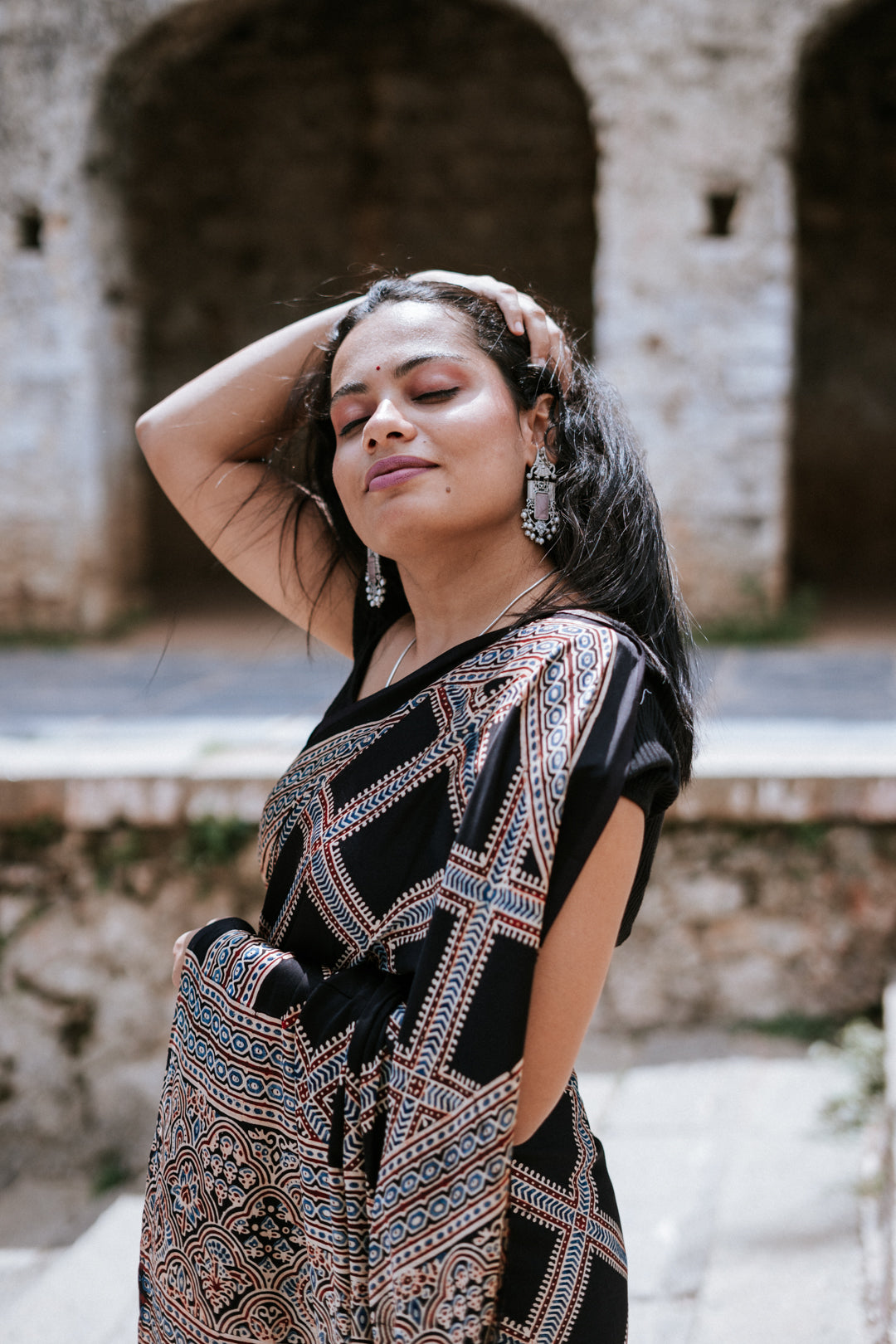 Like a gentle wind, the colours of Ajrakh Sarees leave an everlasting impact, making them a great choice for parties. Each fold weaves tales of ancient artistry and hidden love of the hands that made it.