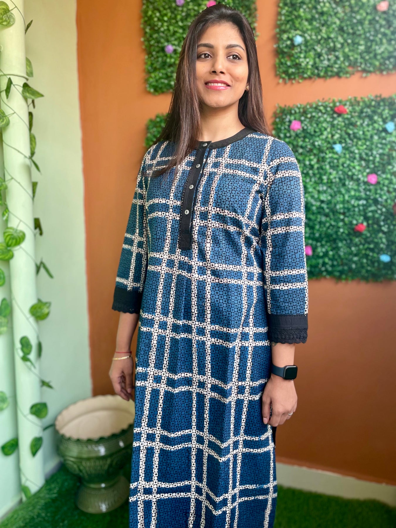 Product Description: If you aren't too fond of floral prints, this checked kurti is great as a daily wear. The kurti offers ease in movement and the print looks funky and great for the age group of 22 and above. Handloom Kurti designs are various in our catalogue. Find designer handloom kurtis at every price.