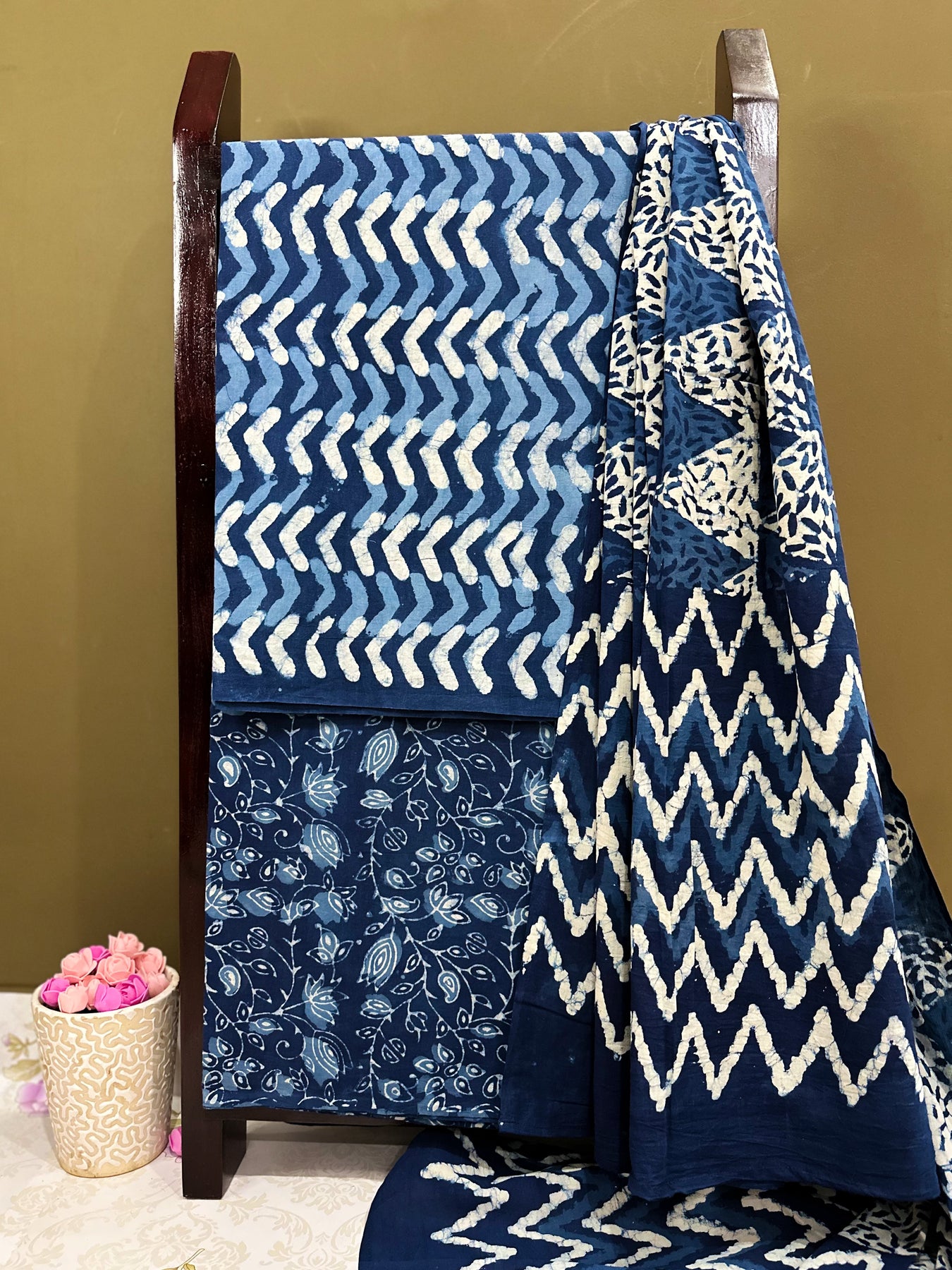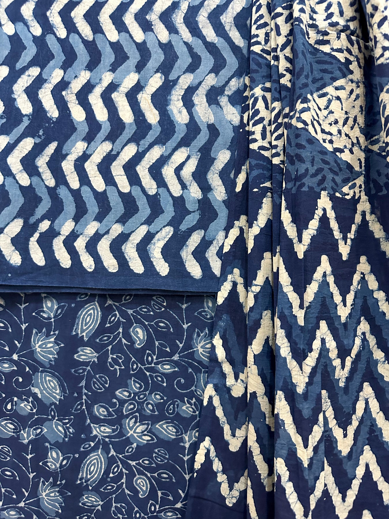 A survival of Indian tradition, the indigo print suit set is comfortable as a day wear. These suit sets hint at the long held tradition and the immense hardwork of the artisans.