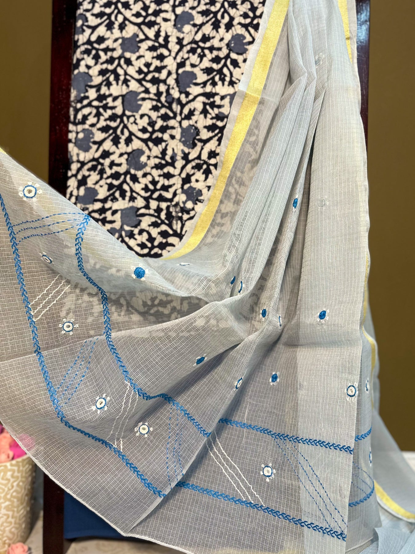 Alluring Kota Suit Sets with hand-embroidered dupattas are perfect for functions where you want to stand out. The enchanting print looks ravishing and the organic cotton and dyes provide utmost comfort. A must-wear for occasions, big or small; this suit set is a great pick.